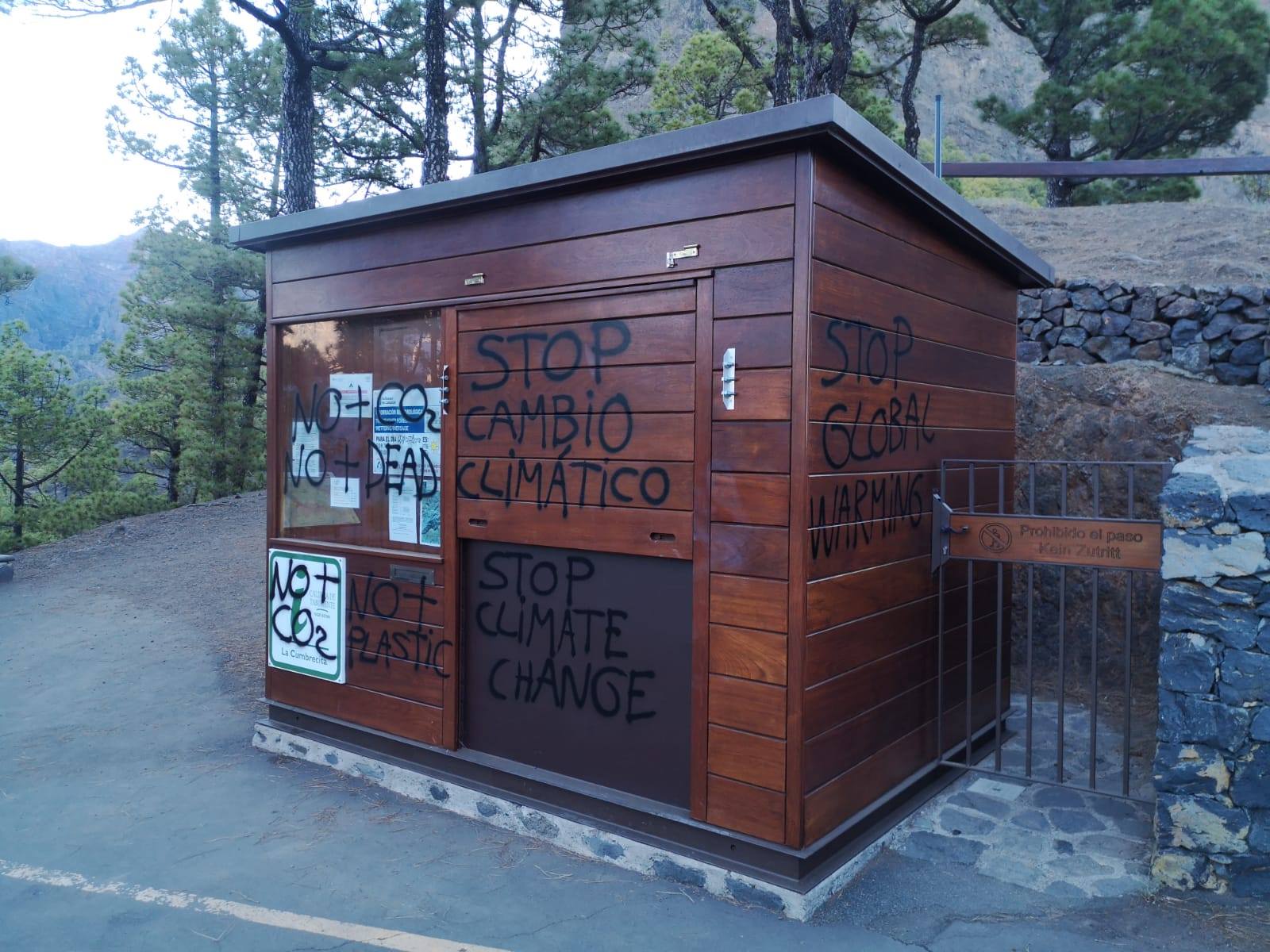La caseta de información del Mirador de la Cumbrecita amanece llena de pintadas