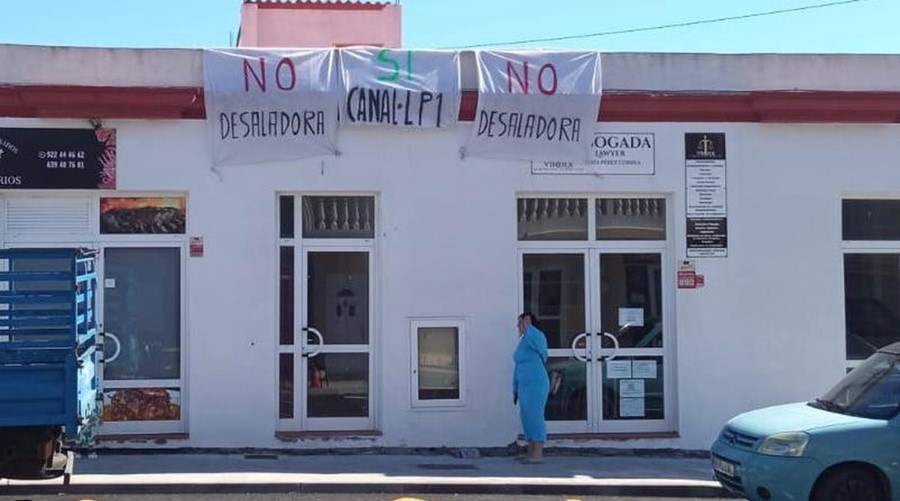 Agua para La Palma celebra la «rebelión» vecinal en Fuencaliente con pancartas contra la desaladora y a favor del arreglo del canal LP-1