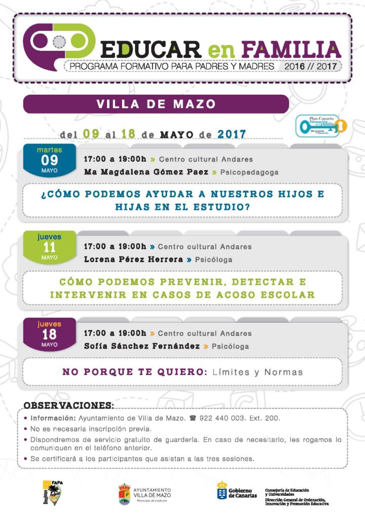 El Ayuntamiento de Villa de Mazo pone en marcha a través del área de Servicios Sociales y Educación, una nueva edición del programa formativo Educar en familia, una iniciativa de la Consejería de Educación del Gobierno de Canarias. El seminario trata de orientar a los padres y madres en métodos y estrategias relacionadas con la educación de los hijos e hijas.