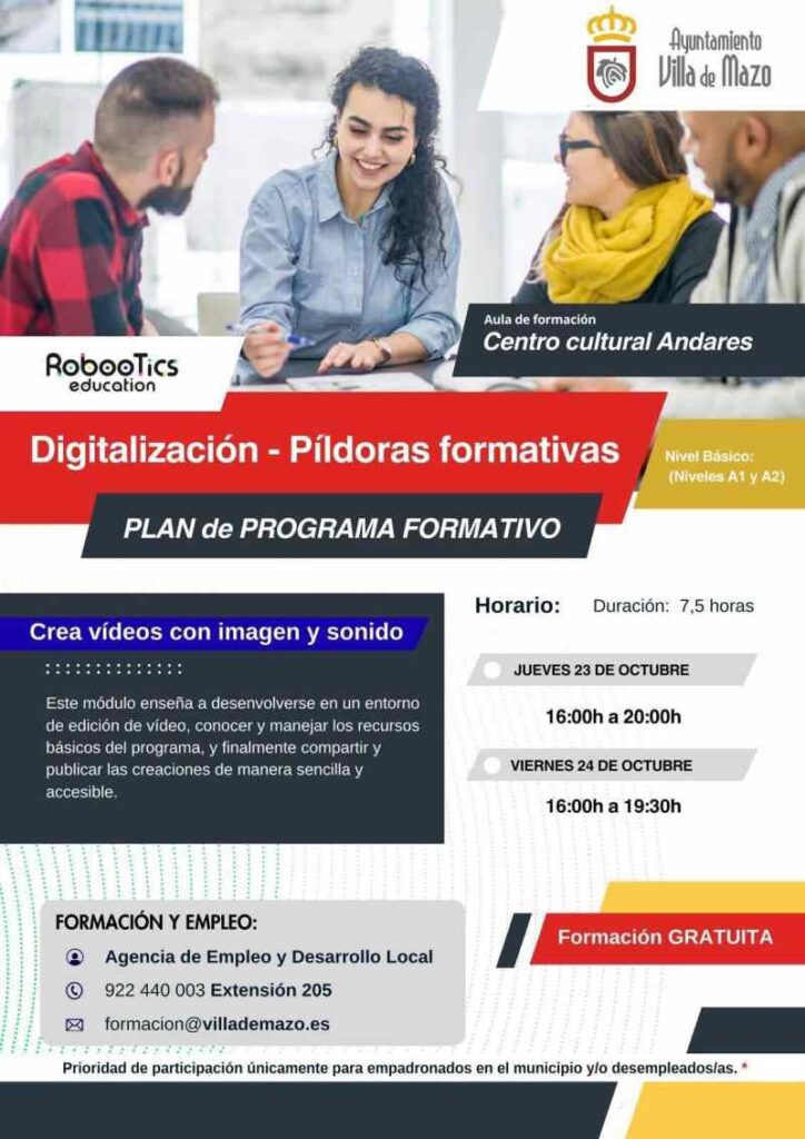 El Ayuntamiento de Villa de Mazo impulsa la digitalización ciudadana con un nuevo módulo de píldoras formativas que se desarrollará los próximos días 23 y 24 de octubre, en el Centro Cultural Andares. El programa permitirá que los participantes puedan adquirir conocimientos prácticos sobre edición de vídeo, conocer y saber emplear los recursos de los programas de edición y compartir sus creaciones de manera ágil y sencilla. El programa Píldoras formativas durará hasta junio de 2026. Son varios talleres de 7,5 horas cada uno y de diferentes temáticas, siendo impartido por RooboTics Education en las aulas de formación Andares.