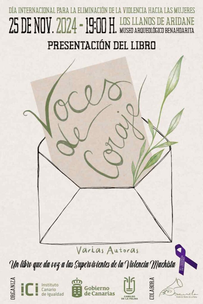 El Cabildo de La Palma, a través del Servicio de Acción Social que dirige Ángeles Fernández, dará voz a seis mujeres y una niña víctimas de violencia de género a través de la presentación del libro Voces de coraje, que se presentará el próximo 25 de noviembre, a las 19:00 horas, en el Museo Arqueológico Benahoarita. La iniciativa se enmarca en las acciones que pone en marcha la Corporación insular con motivo del Día Internacional de la Eliminación de la Violencia contra la Mujer.
