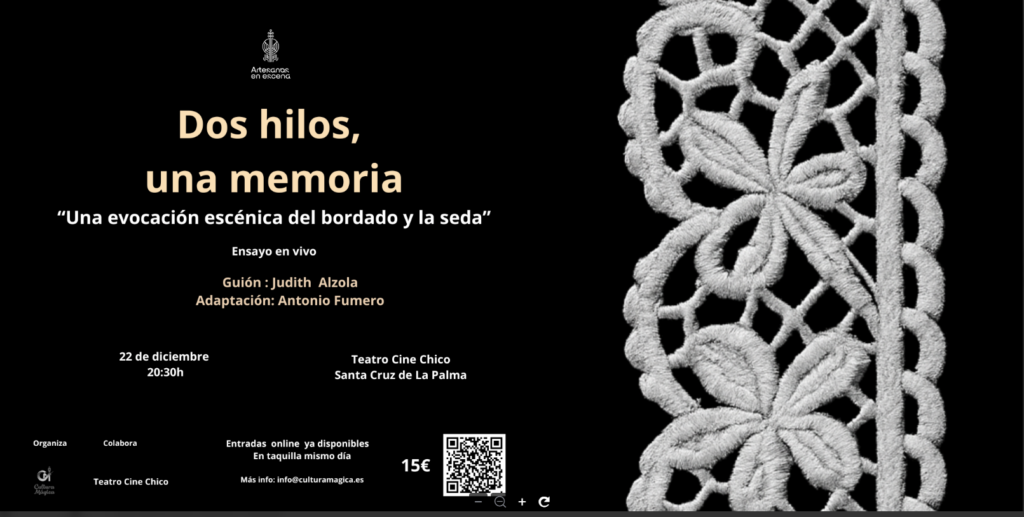 Tras el éxito de Huellas de madera y sal, el pasado mes de agosto, la experiencia teatral que subió el oficio de la carpintería de ribera al escenario, Cultura Mágica vuelve a apostar por la recuperación de los oficios tradicionales de la isla. Su marca Artesanos en escena, presenta Dos hilos, una memoria, una evocación teatral dedicada a la «delicada, íntima y profundamente femenina tradición del bordado y la seda» en La Palma, representada por actores y actrices locales y artesanas reales.