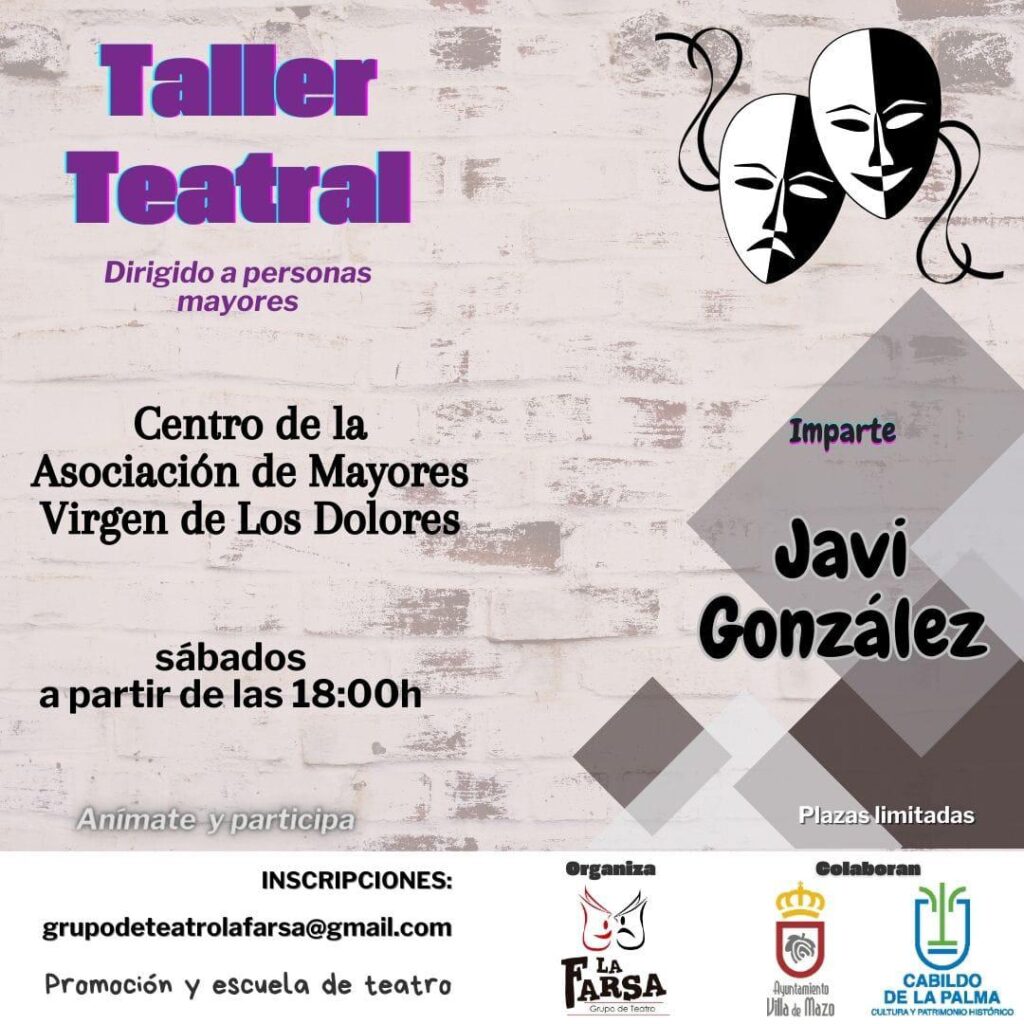 El Ayuntamiento de Villa de Mazo junto al grupo de teatro La Farsa organiza varios talleres teatrales dirigidos a mayores del municipio. La primera sesión tendrá lugar este sábado, 9 de marzo, a partir de las 18:00 horas, en el Centro de la Asociación de Mayores Virgen de Los Dolores.