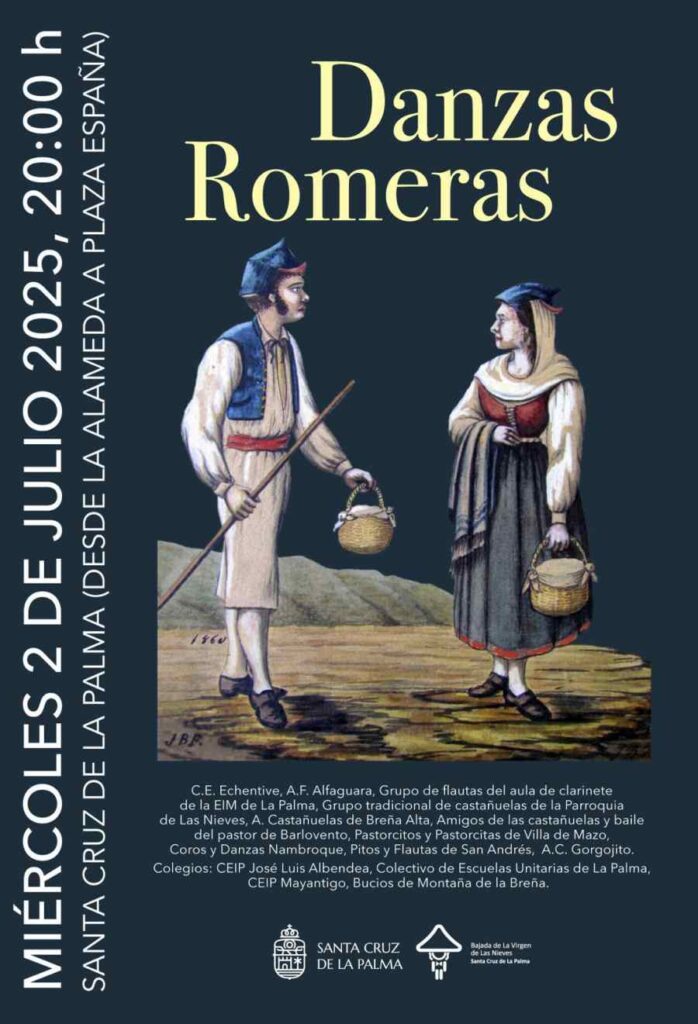 Ya en la edición de la Bajada de la Virgen de 1925, por ejemplo, se organizó un pasacalles con los bailes de pastores de San Pedro Apóstol de Breña Alta y San Juan Bautista de Puntallana. La denominación y la puesta en escena de las ‘Danzas Romeras’ obedecen al formato del resto de los números tradicionales de las Fiestas Lustrales: carácter simbólico y representación callejera. El número aglutina las danzas vinculadas al sirinoque, las distintas variantes del tajaraste palmero o el baile de los romances, un género hoy en día prácticamente olvidado.