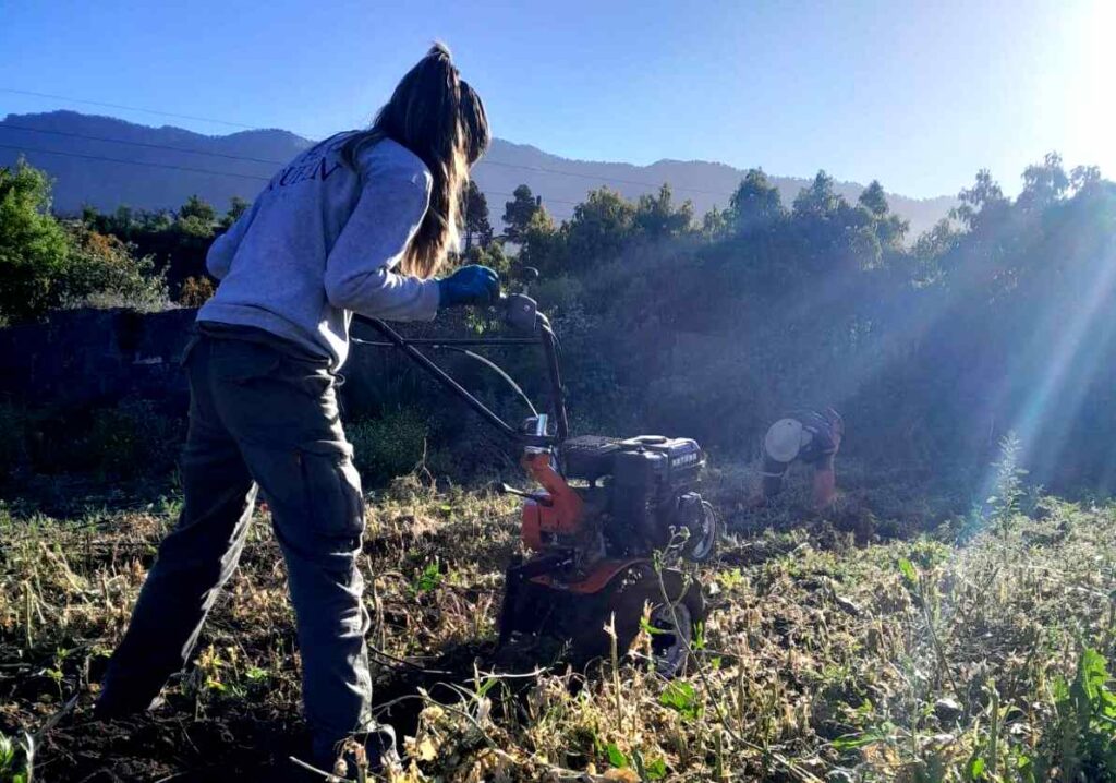 SLAM, imagino que usted sabrá que 20 mil metros son unas 4 fanegas. Si se da un paseo por las zonas de reconstrucción de fincas de plátanos verá que tipo de maquinaria usan. Por otra parte, yo tuve la suerte de conocer de niño la cultura de medianías y sé el trabajo que da una yunta de vacas. También sé lo agotador que es manejar un moto cultor como el que maneja esa mujer joven. Si la tierra está complicada, es un trabajo agotador.