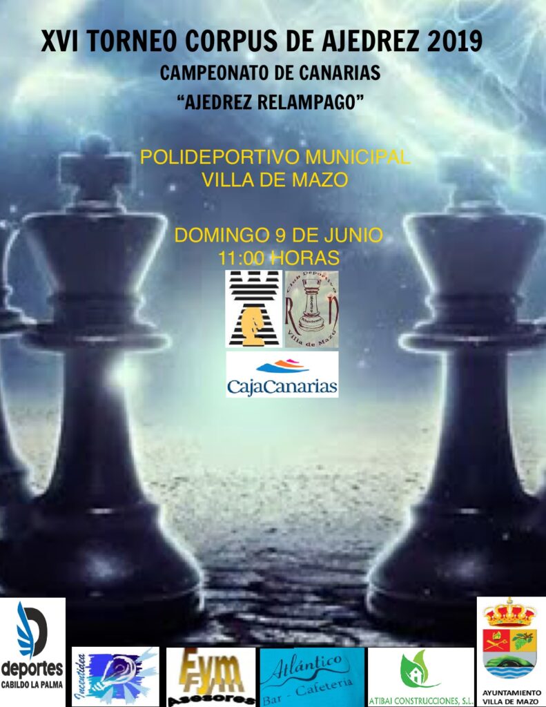 El próximo domingo se disputará en el Polideportivo municipal de Villa de Mazo ‘David Jimenez Silva’ el I Campeonato de Canarias de Ajedrez Relámpago, partidas 4’+2’’, modalidad en la que destaca la rapidez de cálculo de los jugadores, aperturas agresivas y apuros de tiempo que determinan en ocasiones sorpresas en el resultado final, pero sobre todo emoción y partidas frenéticas (http://federacioncanariadeajedrez.com/xvi-torneo-corpus-de-villa-de-mazo-campeonato-de-canarias-de-ajedrez-relampago/ ).