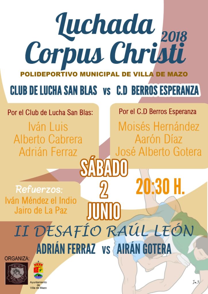 Mazo celebra su tradicional Luchada Corpus Christi este sábado 2 de junio, a las 20:30 horas, en el Polideportivo Municipal, un encuentro organizado por el Ayuntamiento y el Club de Lucha San Blas.