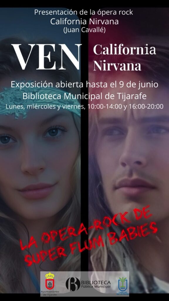 La Biblioteca Municipal de Tijarafe acoge hasta el 9 de junio una exposición sobre la ópera rock California Nirvana, compuesta por el compositor tijarafero Juan Cavallé. Este trabajo musical, aún inédito, ahonda en las raíces históricas y culturales del movimiento hippie. La muestra, organizada por la Concejalía de Cultura, podrá visitarse los lunes, miércoles y viernes de 10 a 14 y de 16 a 20 horas.