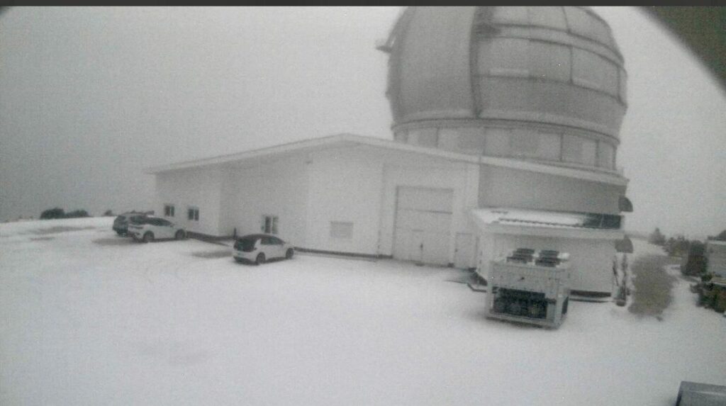 Las cumbres de La Palma registran la primera nevada del invierno, cubriendo un manto blanco el Roque de Los Muchachos, donde se alcanzan temperaturas de -2ºC. Una jornada de bajas temperaturas y lluvias, especialmente en la zona norte y este de la Isla Bonita. Además, a primera hora de la mañana, se han producido también tormentas.